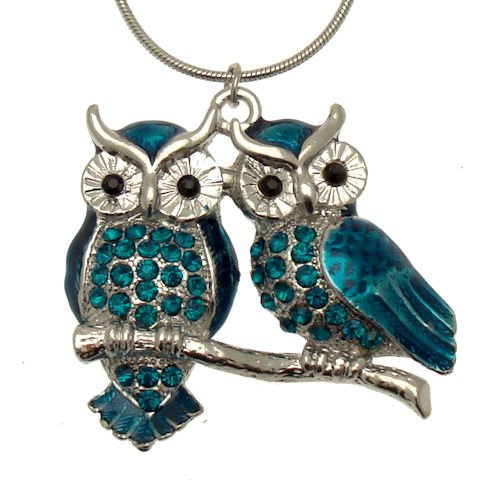 This Gorgeous Turquoise Blue Double Owl Necklace is crafted on a silver coloured frame and featuring Glossy Turquoise Enamel with sparkling Blue Zircon Crystals. This stunning fashion necklace is perfect for a gift and makes a stunning addition to a jewellery collection. Owl Pendant Measures: 4.3cm x 3.8cm. Chain Length Measures: 18 inches with a 3 inch extender. Gift Boxed and Beautifully Presented. Matching Brooch and Hair Slide available.
