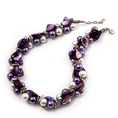 Exquisite Faux Pearl & Shell Composite Silver Tone Link Necklace (Purple & White)