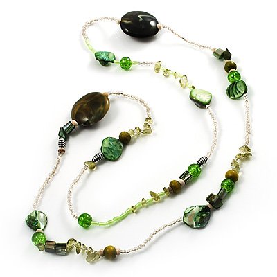 Sparkle in the many colours of gems with this pretty Long Exquisite Glass & Shell Bead Necklace. Featuring a long bead design, made of shell chips, glass and resin beads and semiprecious amethyst stones in hues of grass green, olive green and transparent. The necklace measures about 96cm in length, and an easy-to-wear, no fastening so can be slipped over the head.